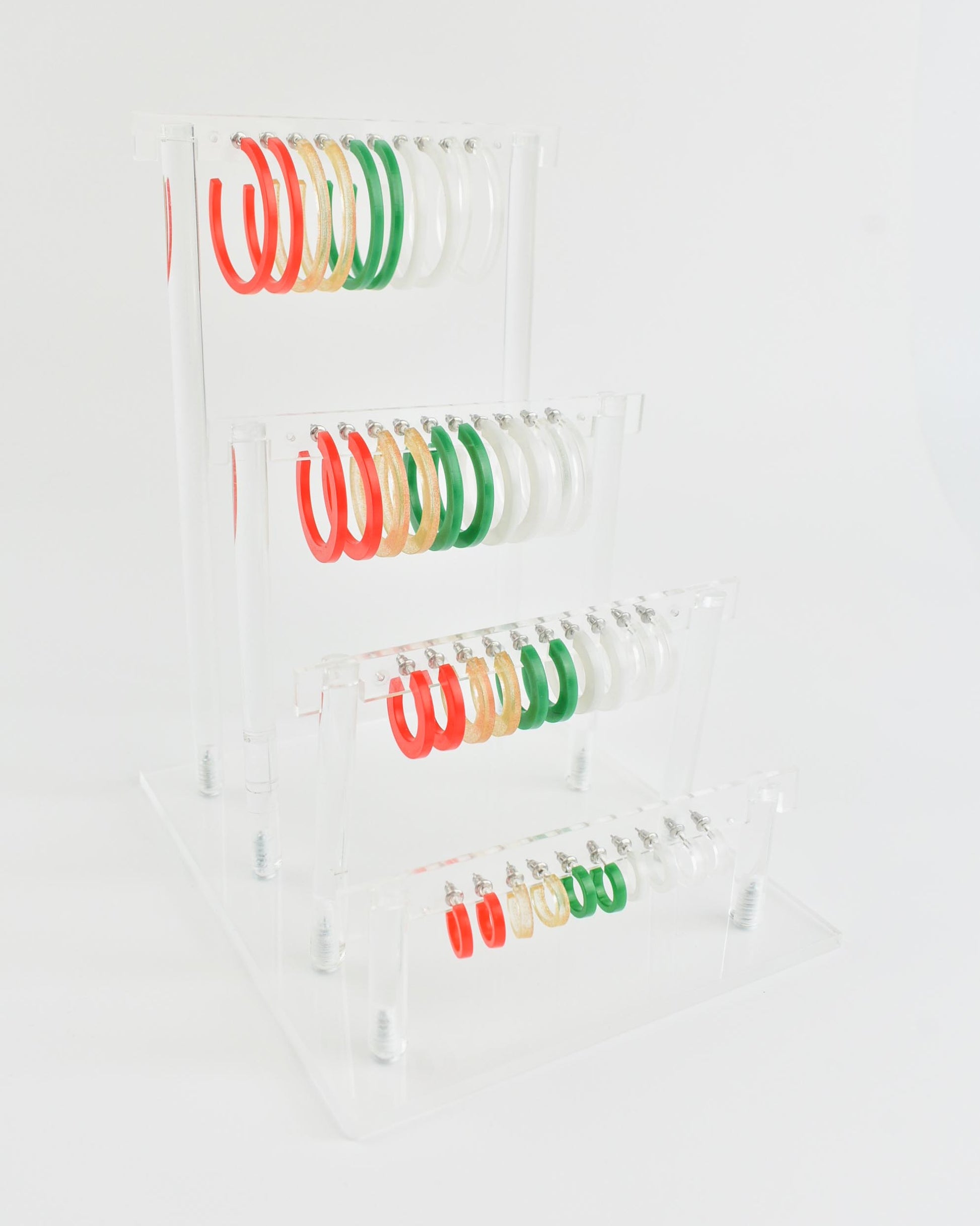 Our Holiday color rainbow has one pair each of red, gold glitter, green, pearl, and white glitter hoops in each size on a complimentary hoop display!